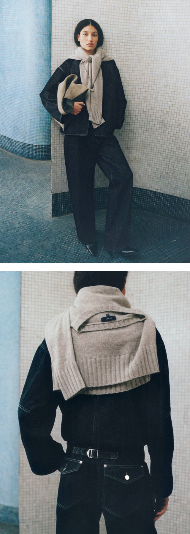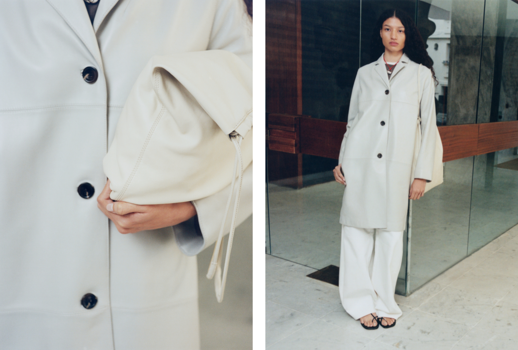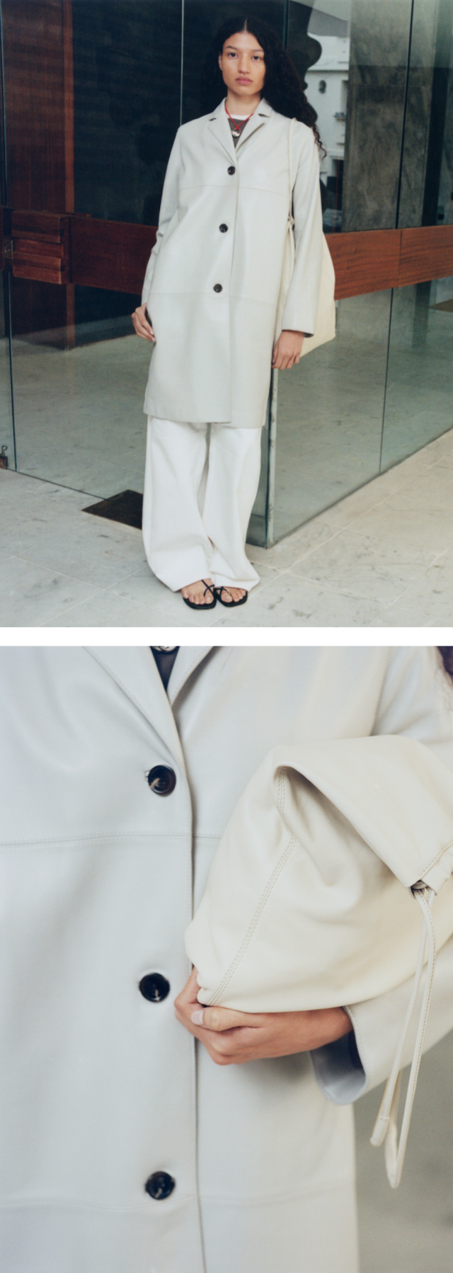 A palette of white, beige and chalk tones shapes an urban and feminine wardrobe. Materials are layered and combined with understated elegance: double-face heathered wool, supple leather, poplin and textured denim.