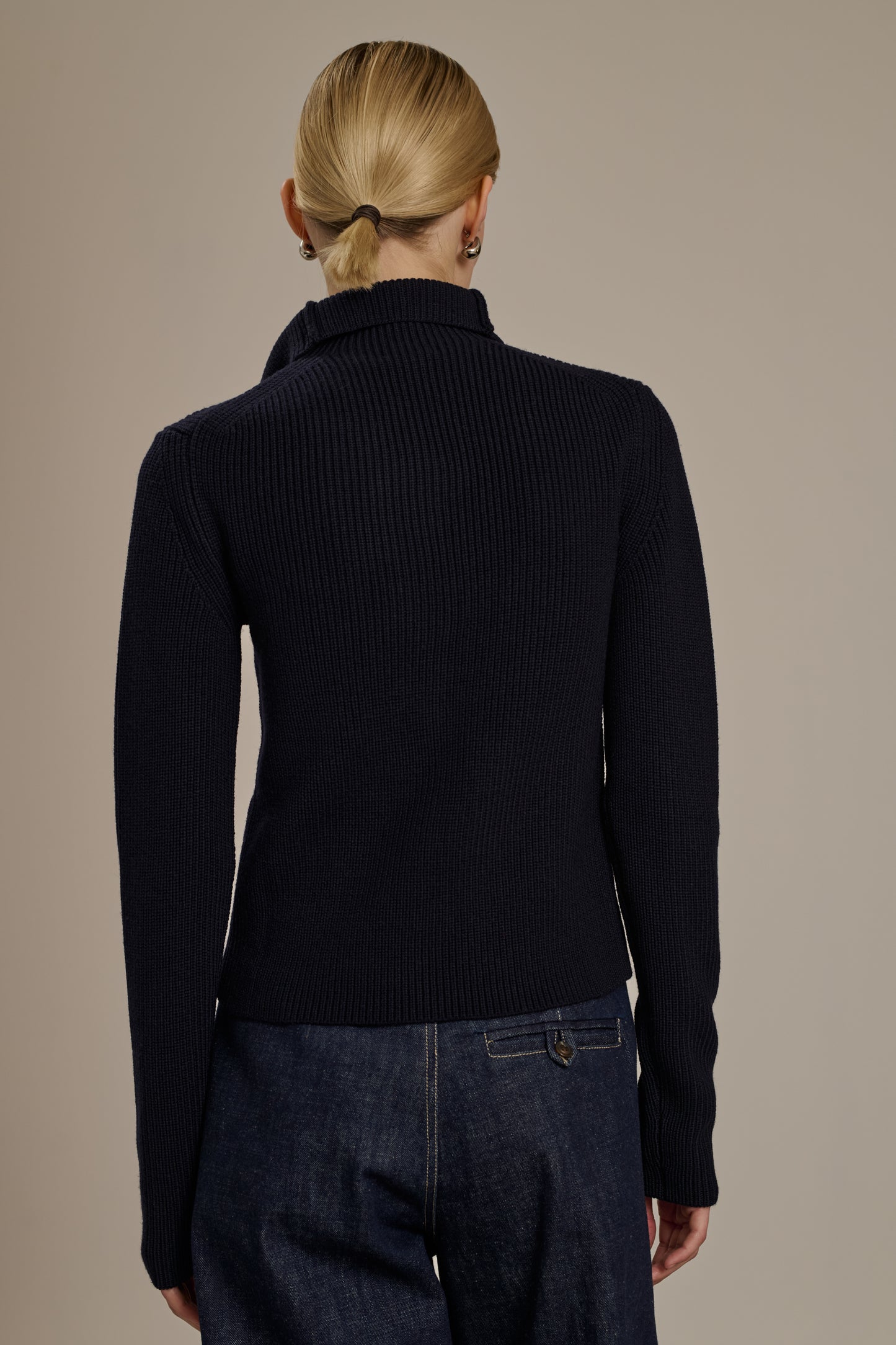 WIMY is a fitted ribbed knit cardigan. Numerous buttons allow for an adjustable collar, to be worn high or open. It can be worn directly on the skin as a cardigan or layered as a lightweight jacket. It is part of our monogram "S" embroidered line. This version is made from fine and warm merino wool.